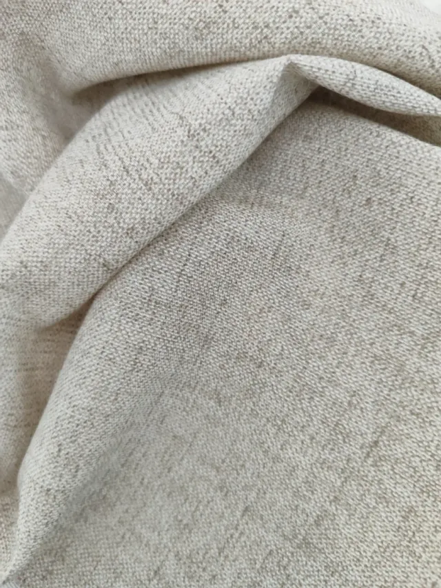 Detalles del productoBonita tela o retal loneta de color beige jaspeada, diferente en cada cara. Muy actual. Composición alta en algodón con algo de fibra, no se arruga tanto como el puro algodón. Muy buena calidad. Ideal para una decoración elegante o para confección.