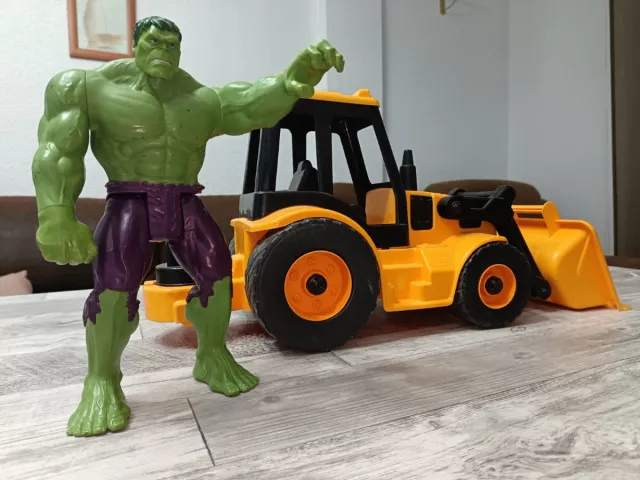 Se vende conjunto de juguete. - Retroexcavadora de color amarillo y negro. - Muñeco articulado del personaje Hulk.