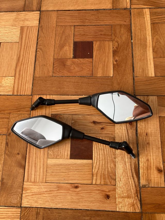 Par de retrovisores para moto KTM. Diseño deportivo y elegante. - Color negro. - Material: Plástico y metal. - Forma: Hexagonal.
