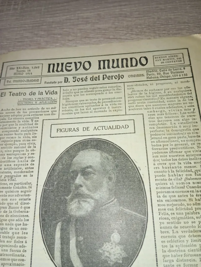 Detalles del productoEjemplar de la revista Nuevo Mundo con fecha de mayo de 1914. Contiene artículos de actualidad y reportajes.