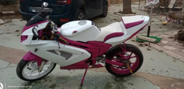 Detalles del productoMoto Rieju RS2 Pro Max con un diseño deportivo en blanco y rosa.