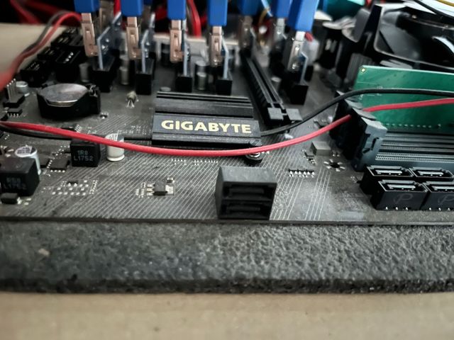 • Placa base (Motherboard): GIGABYTE especializada para minería (varios puertos PCIe) – actualmente no funciona
