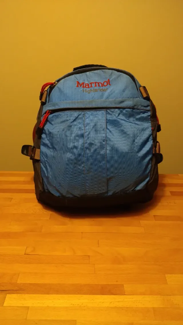 Detalles del productoRiñonera o macuto de la marca Marmot, modelo Highlander. Es de color azul con detalles en negro y rojo.