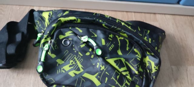 Riñonera deportiva en tonos negros y verdes. - Diseño moderno y juvenil. - Compartimento principal con cierre de cremallera. - Asa ajustable para mayor comodidad.