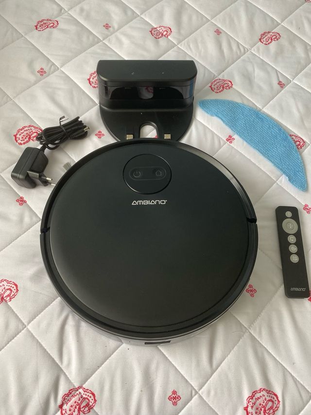Detalles del productoRobot aspirador y friegasuelos de la marca Ambiano. Viene con su base de carga, mando a distancia y un paño de microfibra.