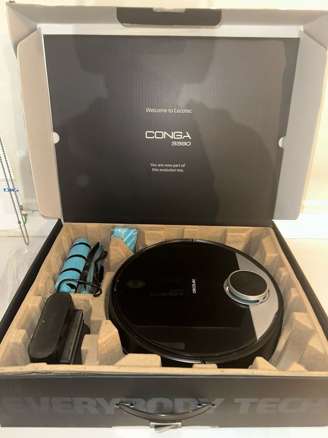 Detalles del productoRobot aspirador Cecotec Conga 3390 en color negro en perfecto estado y funcionando. Aspira, barre, friega y pasa la mopa. Mapeo láser inteligente y además puedes controlar el robot desde tu smartphone.