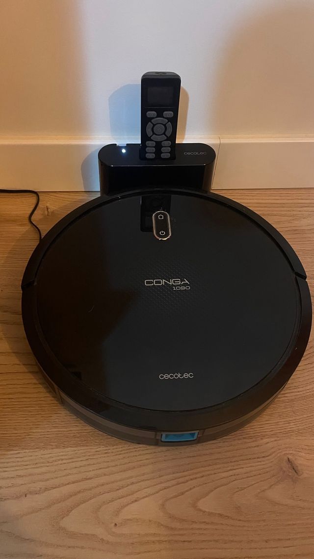 Detalles del productoRobot aspirador Conga 1090 de Cecotec en color negro. Incluye base de carga y mando a distancia.