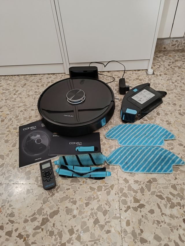 Robot aspirador CONGA con todos los accesorios, tiene depósito para fregado del suelo, mando y rodillos para diferentes funciones
