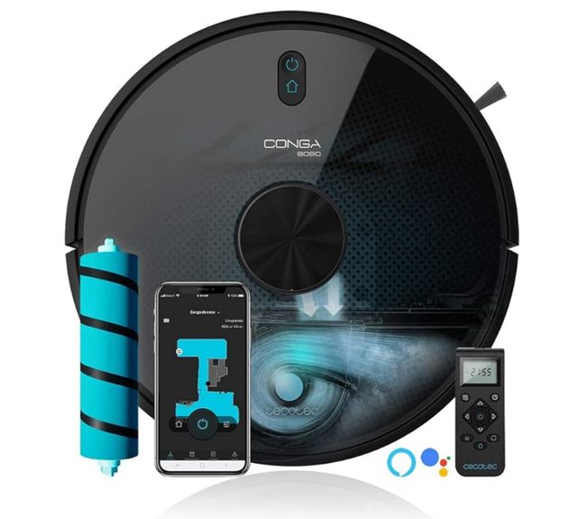 Robot aspirador Conga 6090 con diseño moderno y elegante. - Incluye cepillo central. - Compatible con asistentes de voz. - Mando a distancia incluido.