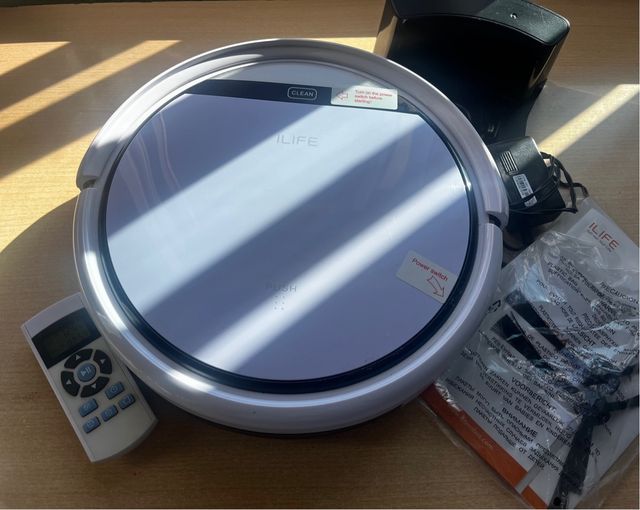 Robot aspirador ILIFE en color blanco y negro. Incluye mando a distancia y base de carga. Incluye recambios. - Diseño redondo. - Botón de encendido. - Indicador CLEAN.