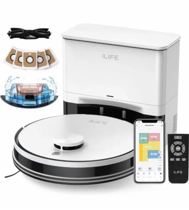 Detalles del productoRobot aspirador ILIFE A30 Pro con base de carga y accesorios.