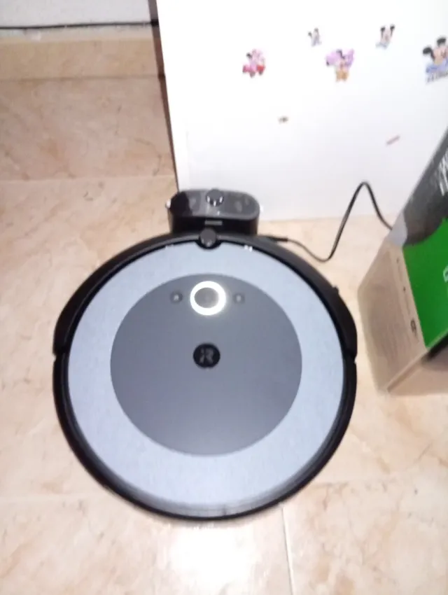Robot aspirador Roomba en color negro y gris. Diseñado para la limpieza automática de suelos. - Forma redonda. - Módulo superior con botones y luces indicadoras.