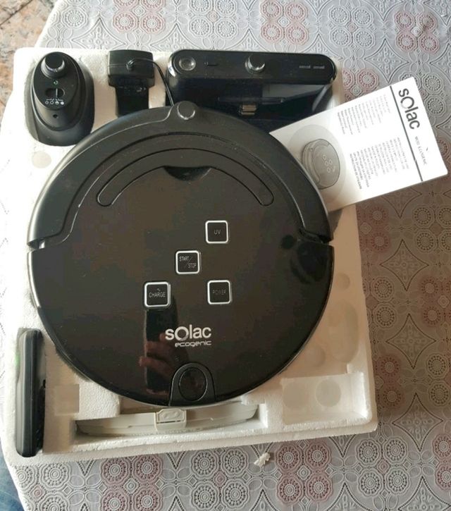 Detalles del productoAspiradora tipo Rumba marca Solac, con la batería nueva a estrenar!! Dispone de mando a distancia con 5 programas de limpieza, lámpara ultravioleta antibacterias. Cepillos laterales para las esquinas y todo en su embalaje original. Se vende por no usar.