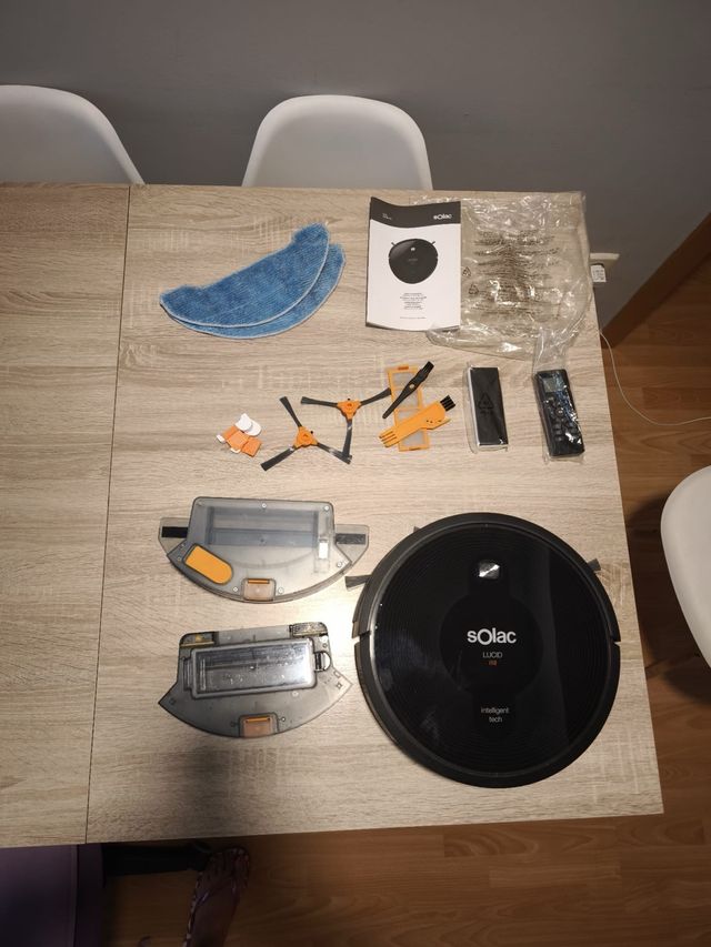 Detalles del productoAspirador robot Solac Lucid I10 en buen estado. Incluye dos mopas, dos cepillos laterales, un cepillo principal, un filtro HEPA, un accesorio para limpieza de esquinas y un mando a distancia. - Perfecto para una limpieza eficiente de tu hogar. - Fácil de usar y mantener. - Incluye todos los accesorios mostrados en la imagen.