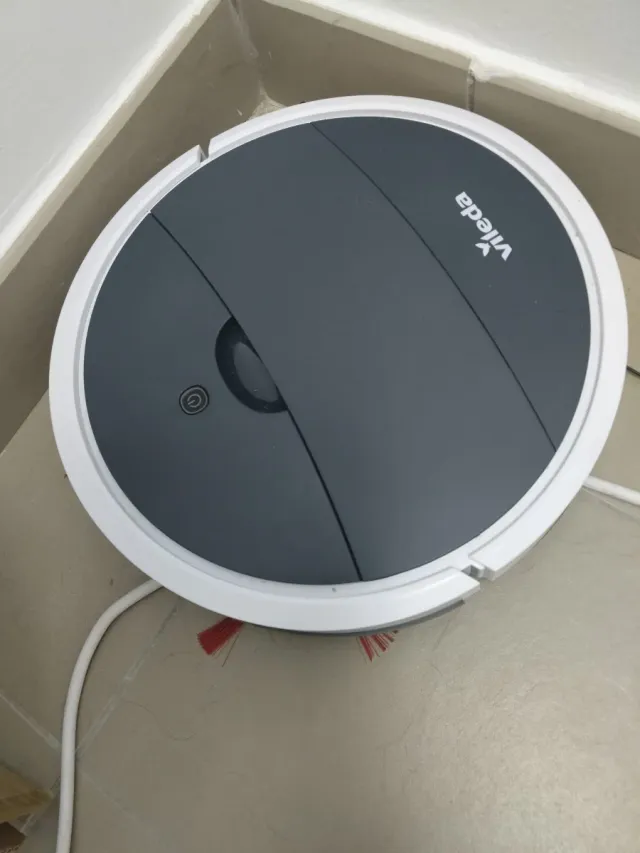 Robot aspirador de la marca Vileda, con un diseño circular y acabado en gris y blanco. - Forma redonda. - Color gris y blanco. - Incluye cepillos laterales.