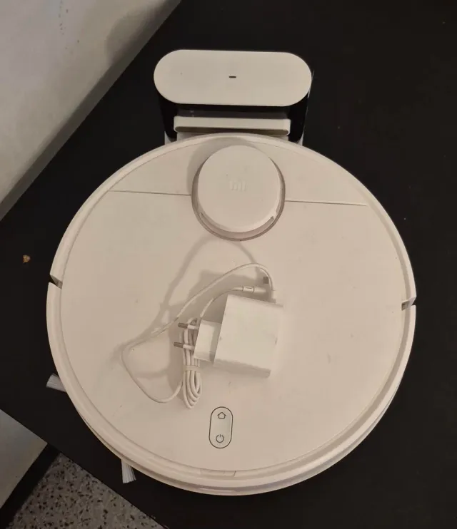 Detalles del productoRobot aspirador de la marca Xiaomi en color blanco. Incluye su base de carga.