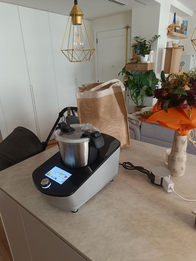 Este robot de cocina firmado por MasterPro tiene una potencia de 1.300W y su batidora funciona a 600W. Dispone de un vaso de acero inoxidable, con una pantalla táctil de 5 pulgadas en color y como se conecta al WiFi, cuenta con más de 350 recetas que se van actualizando.