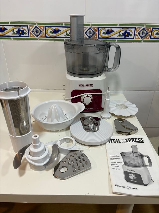 Detalles del productoProcesador de alimentos Vital Express en buen estado. Incluye todos los accesorios que se ven en las fotos: vaso, exprimidor, discos para rallar, picar, amasar, batir, cortar, etc. Perfecto para preparar tus recetas favoritas de forma rápida y sencilla. Muy buen estado, solo utilizada una vez, la tapa tiene un pequeño roto de una caída. Medidas del producto