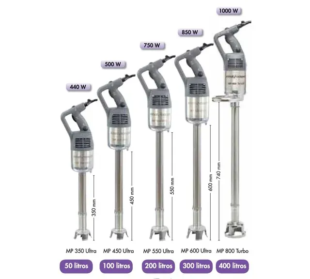 Detalles del productoriturador profesional fijo. Está diseñado especialmente para uso intensivo. Ideal para restauración, servicios de catering y banquetes. Puede triturar, mezclar y emulsionar. Procesa 100 litros - Potencia 500 W.