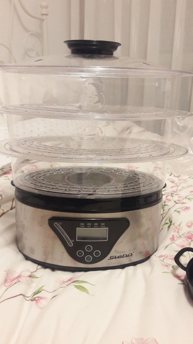 Detalles del productoModelo premiun, de excelente vaporera con ingeniería alemana. Tiene control digital de funciones y temperatura. Está sin estrenar, en su embalaje original. 3 recipientes de gran capacidad, y calidad de materiales. Costó 70 € nueva. Medidas del producto