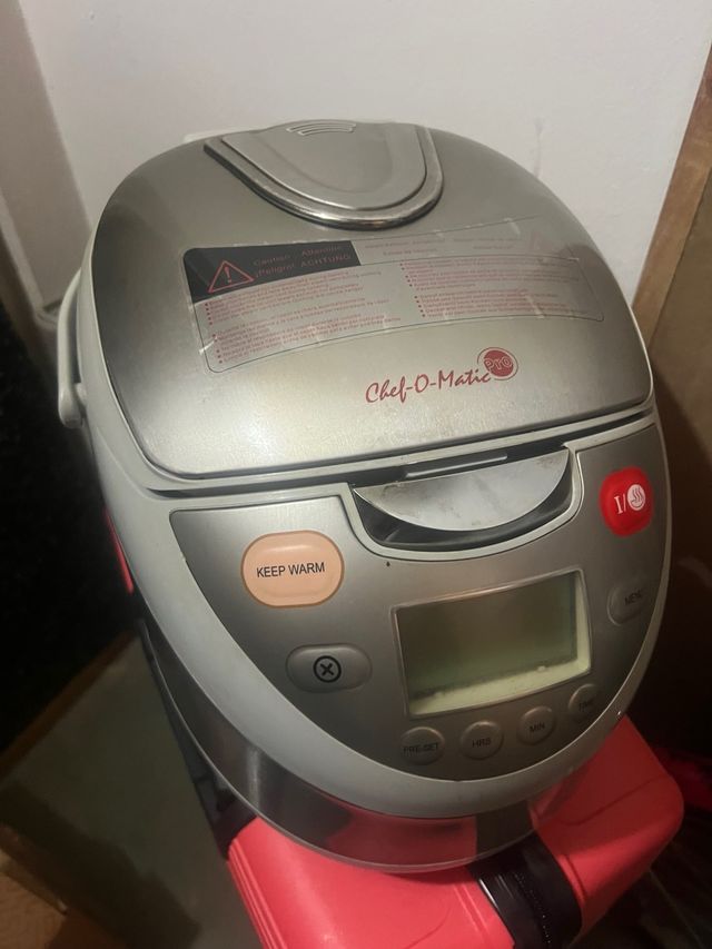 Detalles del productoRobot de cocina Chef-O-Matic Pro en color plateado y blanco. Cuenta con panel de control digital y botones de función.