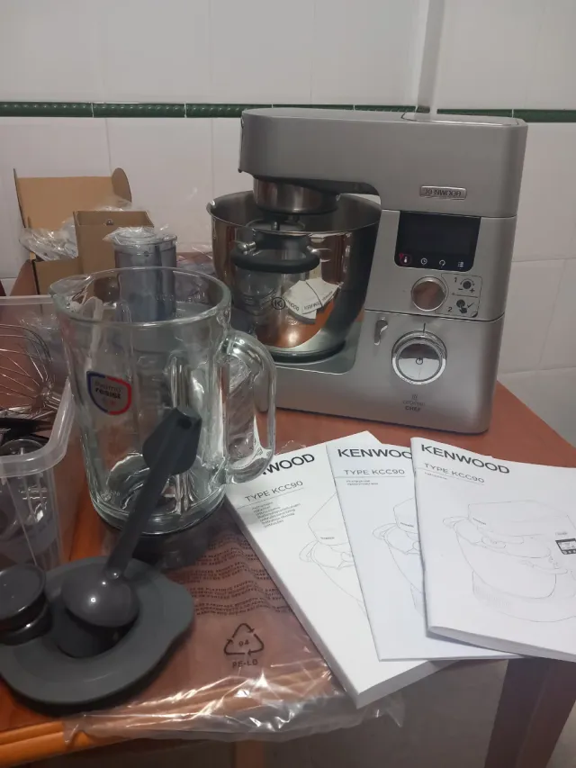 Detalles del productoRobot de cocina Kenwood Cooking Chef KCC90 en color plateado. Incluye varios accesorios para amasar, picar, rallar y batir.