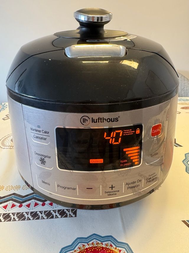- Funciones: Mantener Calor, Cancelar, Descongelar, Guisos, Cocina, Tortilla.