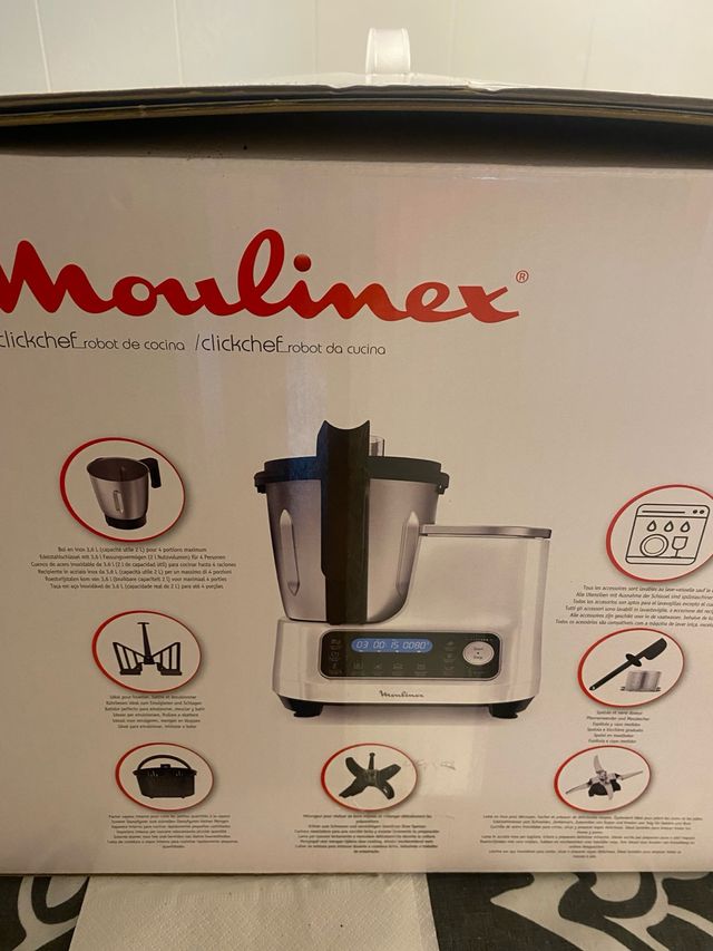 Detalles del productoRobot de cocina Moulinex Clickchef en color blanco. Incluye varios accesorios para facilitar la preparación de alimentos.