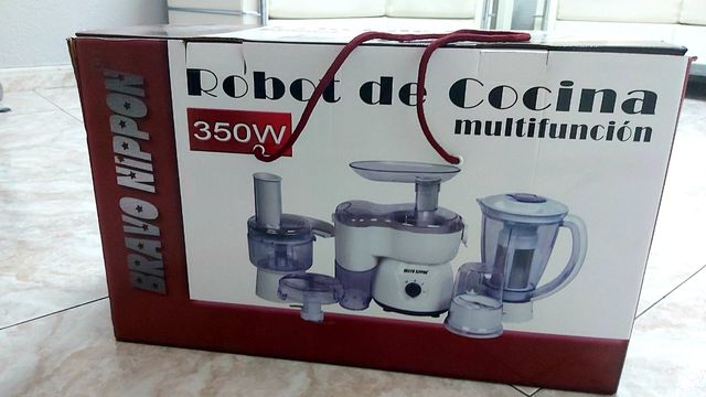 Detalles del productoRobot de cocina MULTIFUNCION sin estrenar. Jarra batidora de 1,5 litros, molinillo, exprimidor, jarra con cuchillas correspondientes para trocear, licuar y triturar. SIN ESTRENAR Medidas del producto