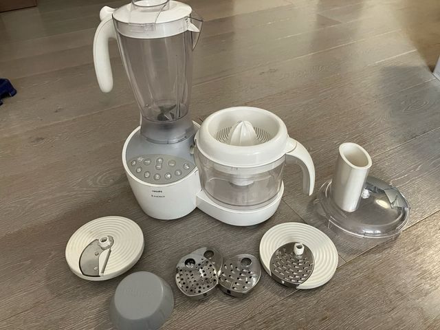 Detalles del productoRobot de cocina Philips Essence con varios accesorios.