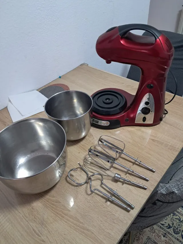 Detalles del productoRobot de cocina de color rojo, ideal para preparar tus recetas favoritas. Incluye varios accesorios para diferentes usos.