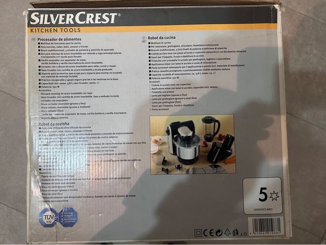 Detalles del productoRobot de cocina multifunción Silver Crest con varios accesorios.