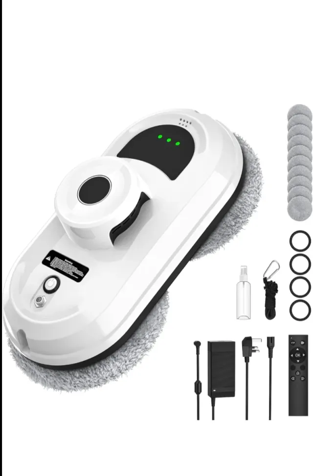 Detalles del productoRobot limpiacristales en color blanco, diseñado para facilitar la limpieza de ventanas y superficies de vidrio. Incluye varios accesorios para su uso y mantenimiento.