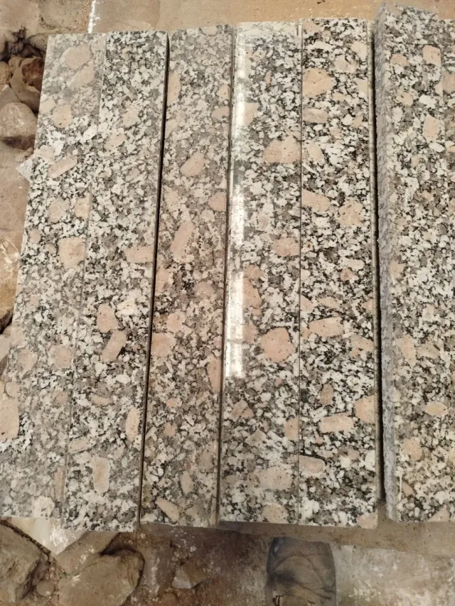 Rodapié de granito con un diseño veteado en tonos claros y oscuros. Hay 34 piezas de 60cm, 68 piezas de 40cm, 8 piezas de 43cm, 21 piezas de 31cm, 8 piezas de 28cm y 7 piezas de 24cm. Altura 8,5 cm.