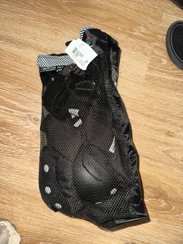 Set de protecciones para patinaje o ciclismo. - Incluye rodilleras, coderas y muñequeras. - Color negro. - Diseño con puntos blancos.