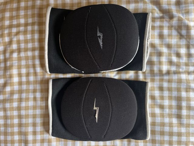 Par de rodilleras deportivas negras con un diseño acolchado y un detalle de logo en forma de rayo. - Color: Negro. - Acolchado protector. - Logo de rayo plateado.