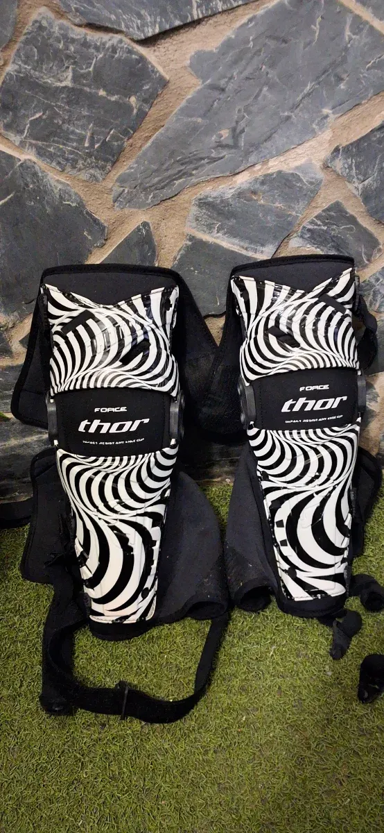 Par de rodilleras Thor Force con diseño llamativo. - Diseño de rayas blancas y negras. - Cierre con correas ajustables.