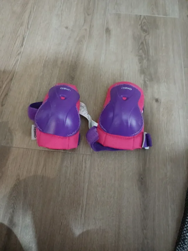 Protecciones para patinaje o ciclismo. - Color morado y rosa. - Marca Oxelo. - Cierre con velcro.
