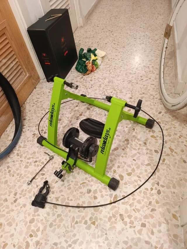 Rodillo para bicicleta con goma en la rueda. - Color verde brillante. - Incluye soporte para rueda delantera.