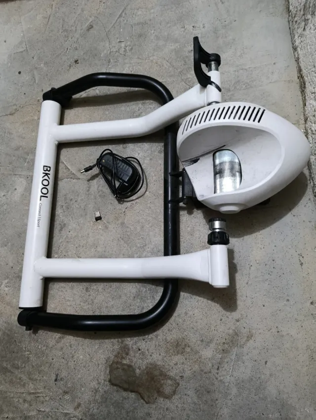 Rodillo Bkool para entrenamiento de ciclismo en interiores. Incluye su cargador. - Estructura blanca y negra. - Diseño plegable para fácil almacenamiento.