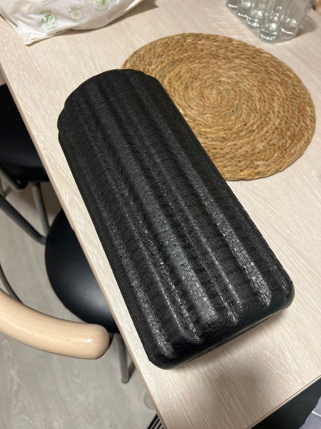 Detalles del productoRodillo de espuma negro con textura acanalada, ideal para ejercicios de estiramiento y masaje muscular.
