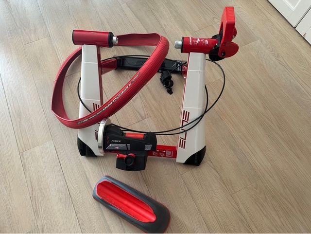 Rodillo de entrenamiento Elite - Estructura blanca y roja. - Incluye cubierta Zaffiro Pro. - Compatible con bicicletas.