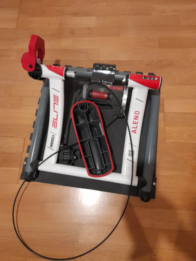 Rodillo de entrenamiento Elite Aleno en color blanco y rojo. - Estructura plegable. - Incluye soporte para rueda delantera.