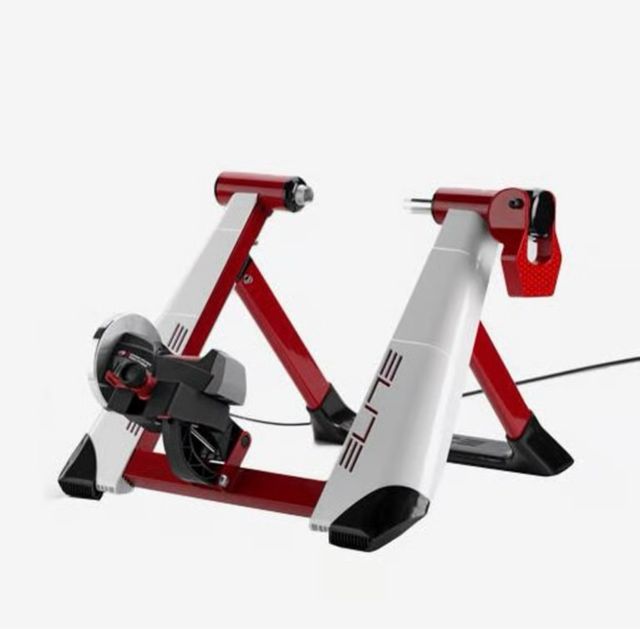 Rodillo de entrenamiento Elite Novo. - Estructura robusta de color rojo y blanco. - Diseño plegable para fácil almacenamiento. - Marca Elite visible en los laterales.