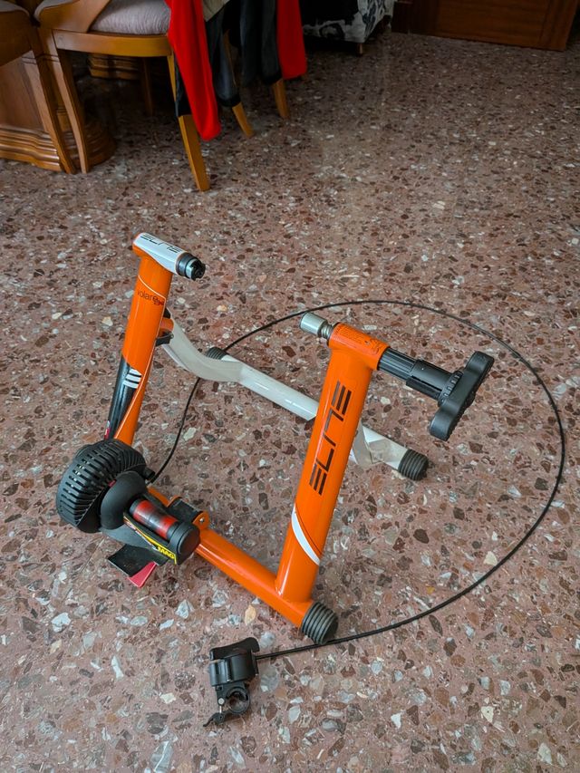 Rodillo de entrenamiento Elite Volare en color naranja. - Estructura plegable. - Incluye resistencia. - Compatible con bicicletas de carretera y montaña.