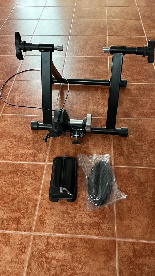 Rodillo de entrenamiento para bicicleta en buen estado. - Estructura metálica negra. - Incluye soporte para rueda delantera.