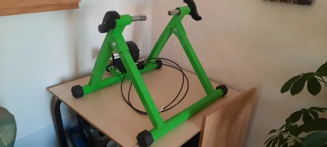 Rodillo para bicicleta de entrenamiento en color verde. - Estructura metálica. - Plegable para fácil almacenamiento. - Incluye cable.