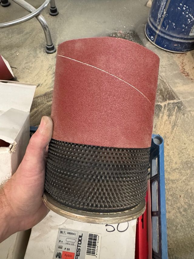 Rodillo lijador para tupí de la marca Festo. - Velocidad máxima de 3000 rpm. - Instrucciones de uso en la etiqueta. - Anillos de lija de 50, 80, 120 y 150