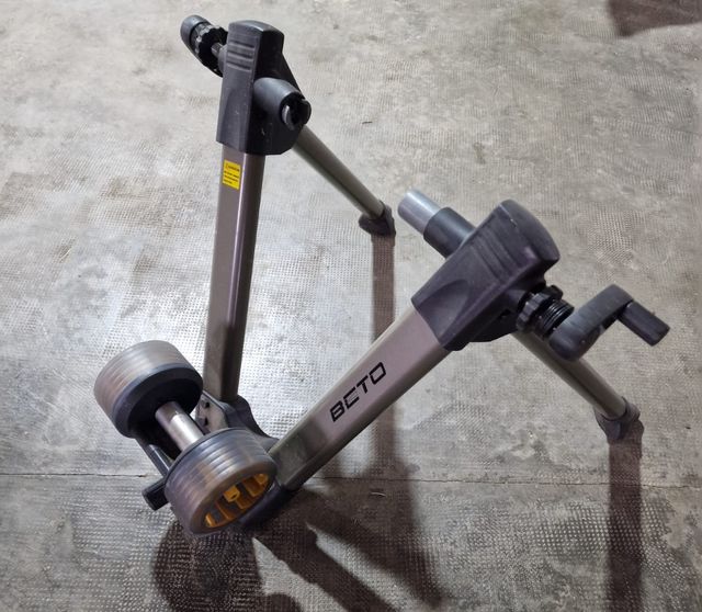 Detalles del productoRodillo de entrenamiento para bicicletas de la marca Beto. Permite ejercitarse en interiores.