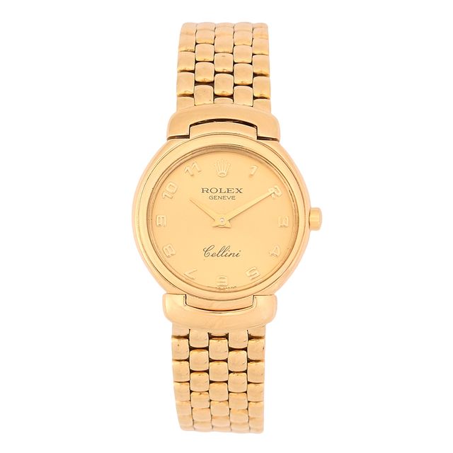 Detalles del productoRolex Cellini 26mm Ref.-6623 es un reloj de lujo de mujer de oro amarillo de 18 kt de segunda mano cn 2 años de garantía, estuche Rolex, sin documentación. Autenticado y verificado, año 1978 aprox. Excelente estado de conservación. Dotado de movimiento de cuarzo calibre 6620, caja de 26mm de diámetro, cristal de zafiro, brazalete de oro con cierre desplegable oculto y esfera dorada. Envíos gratuitos.